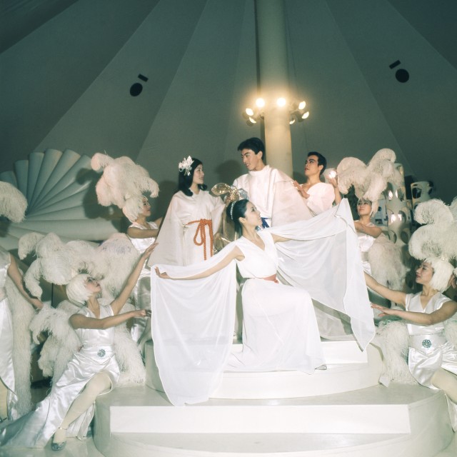 奇妙な衣装を着て見つめ合う男女の周りに、これまた奇抜なカツラを被ったダンサー達。